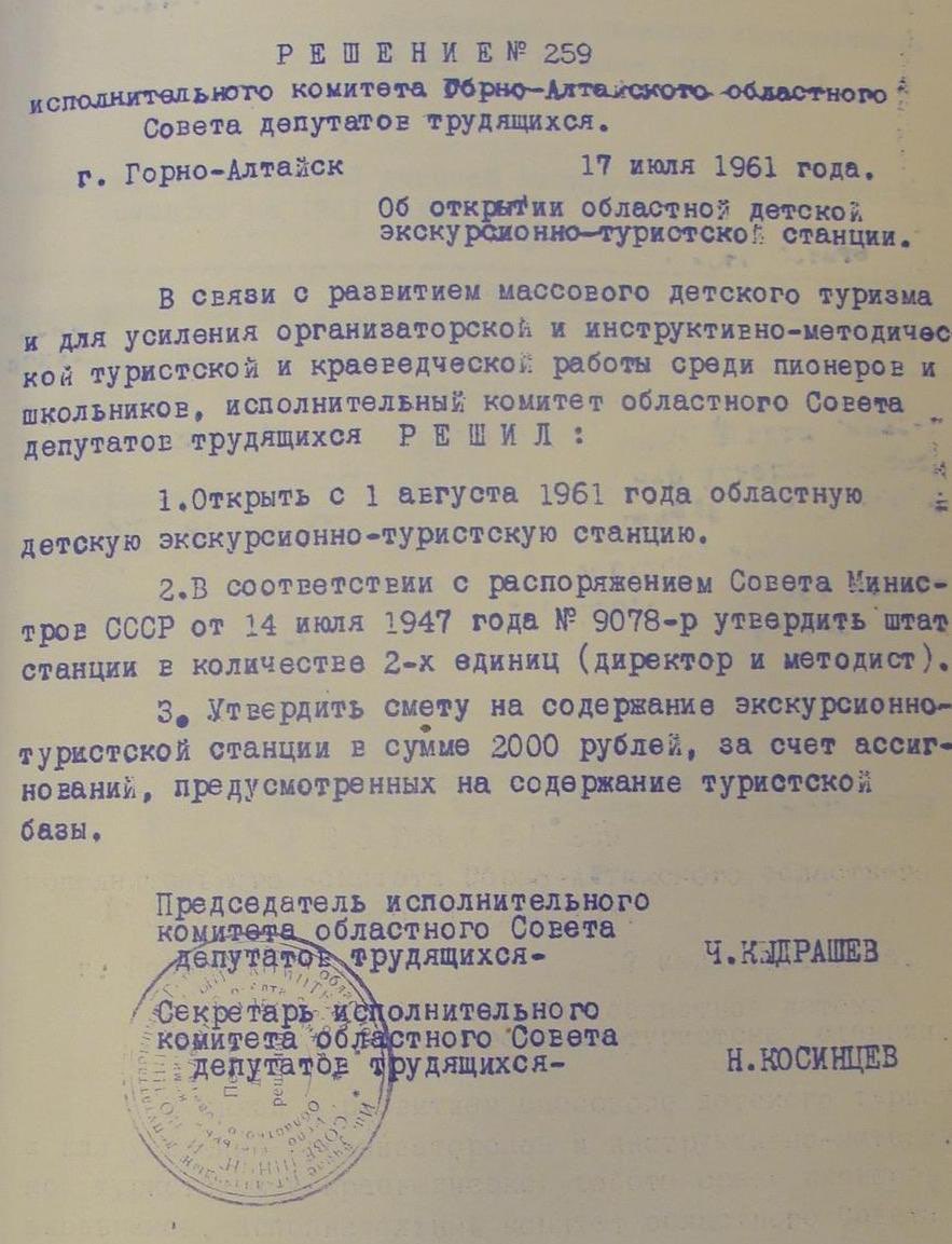 В августе 1961 года решением исполнительного комитета Горно-Алтайского областного совета депутатов была открыта областная детская экскурсионно-туристская станция. Место расположения станции было выбрано не случайно: северный склон горы Комсомольская, большая поляна, берег реки Майма – отличное место для проведения занятий с детьми различными видами туризма.