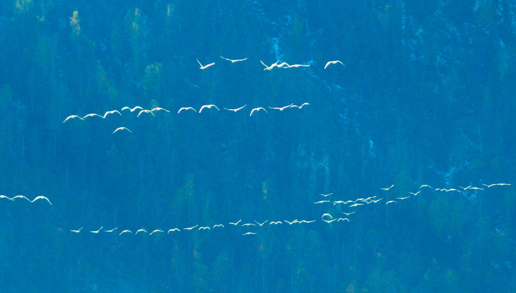 В пролетной стае лебедей отмечены лебеди-кликуны Cygnus cygnus и малые лебеди Cygnus bewickii.