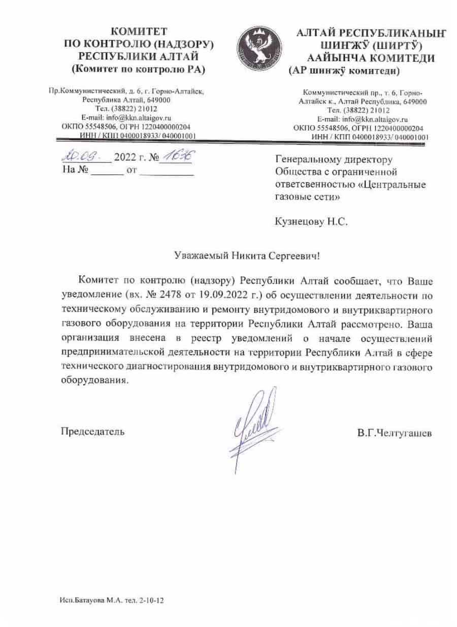 В Республики Алтай ООО «Центральные Газовые Сети» (ООО «ЦГС») также включена Государственной жилищной инспекцией Республики Алтай в специальный реестр.