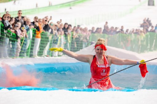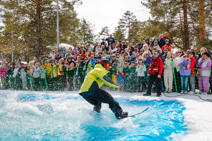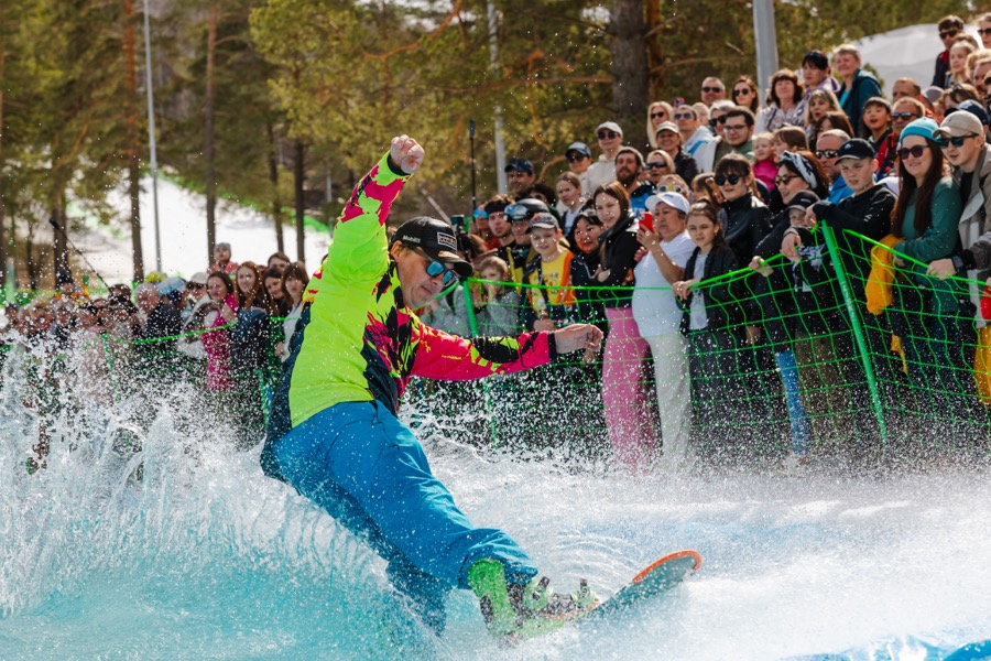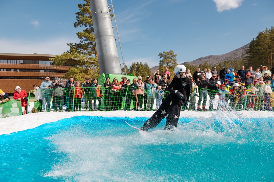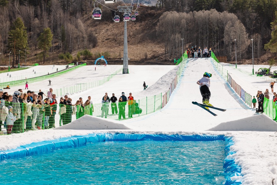 Зимний горнолыжный сезон на курорте Сбера «Манжерок» завершился. Он продлился 150 дней. Сезон завершили традиционно – прыжками в бассейн. Райдеры должны были прыгнуть в бассейн с трамплина, выполнив трюк, или проскользить по поверхности воды, не намочив костюм.