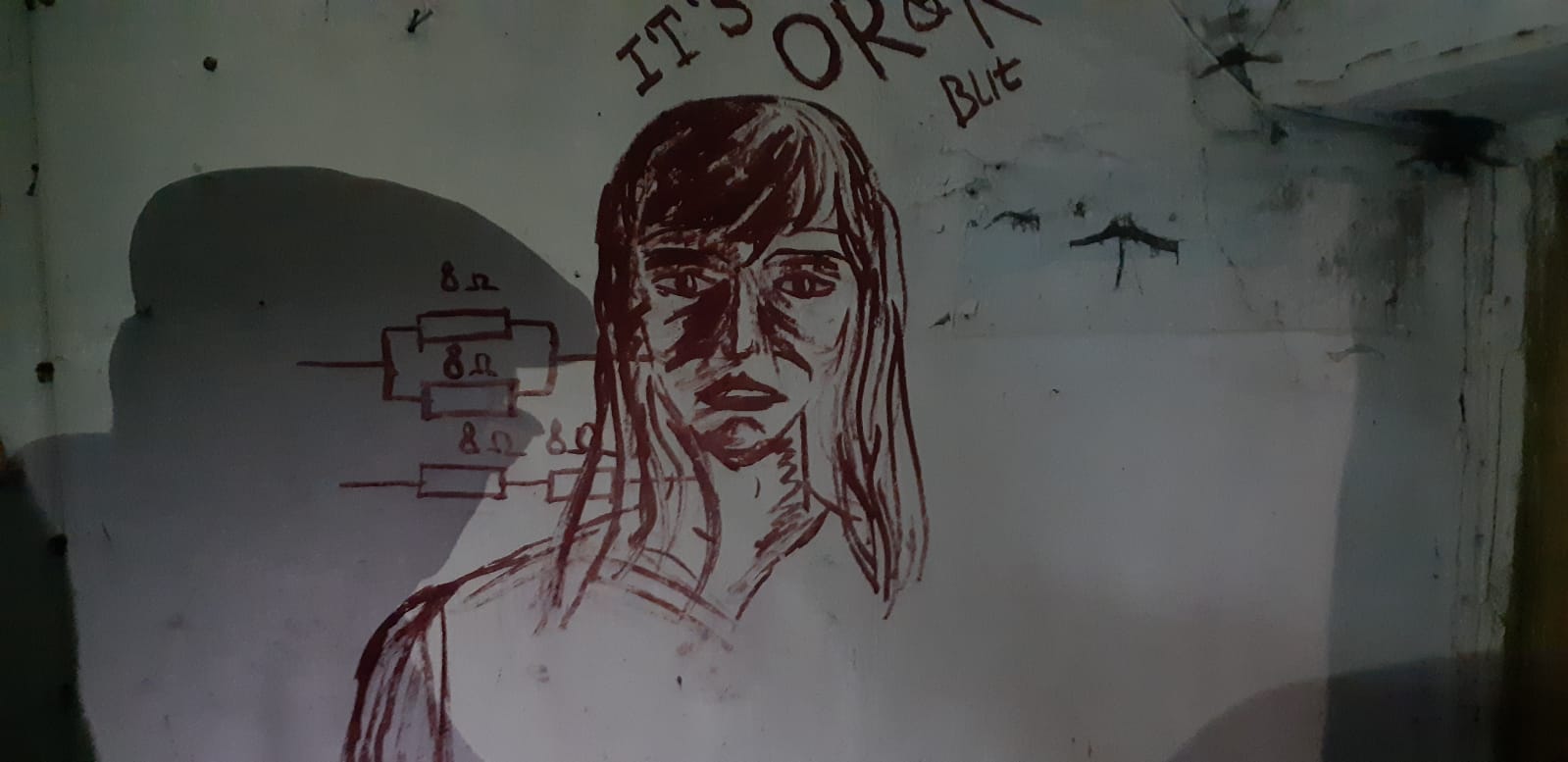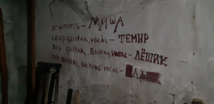 На одной из стен мы видим имена группы, которая здесь репетировала: ударные – Миша, гитара – Темир, бас – Лешик, имя вокалиста, к сожалению, закрашено.