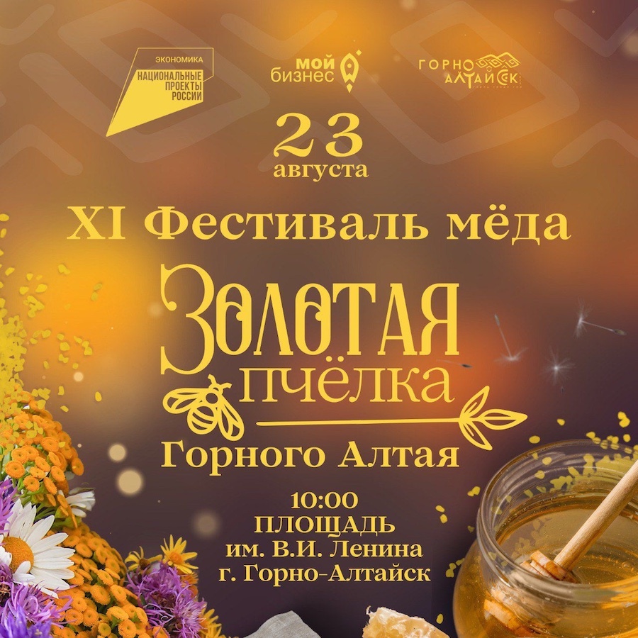 23 августа в Горно-Алтайске состоится фестиваль мёда «Золотая пчёлка Горного Алтая». На сладком празднике каждый сможет приобрести продукцию пчеловодов, сезонные фрукты и овощи, а также уникальные сувениры Горного Алтая.