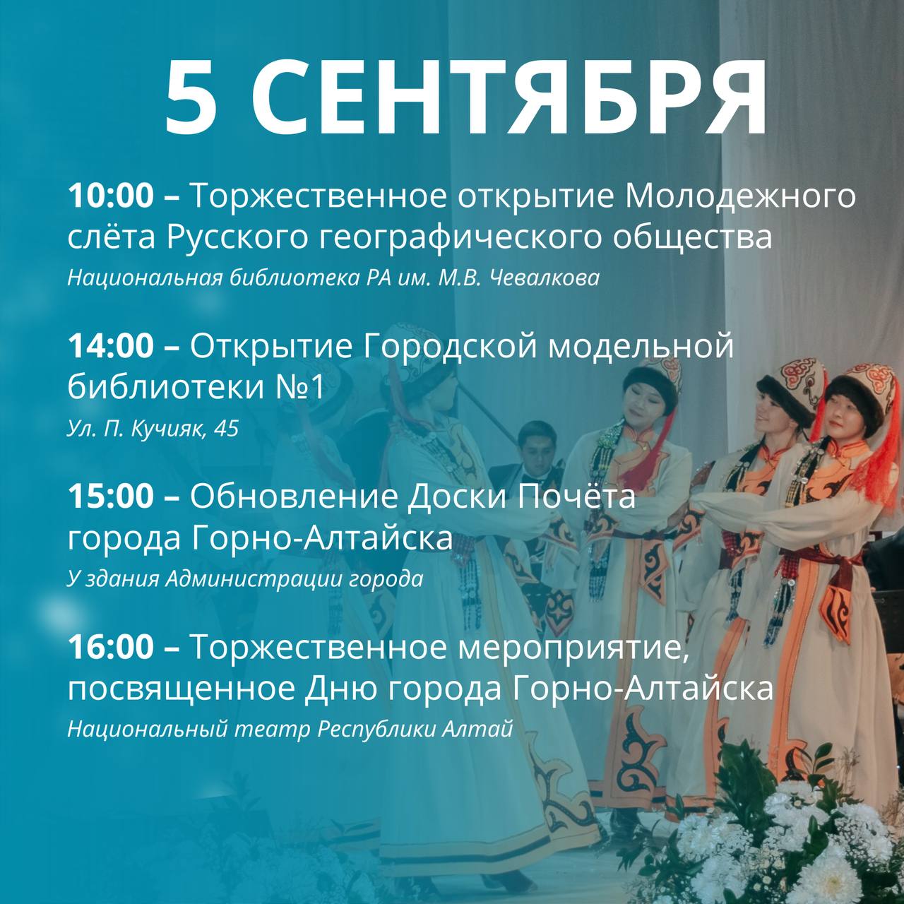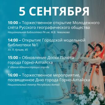 5 сентября – официально-деловой день. Как сообщили в мэрии, откроется Молодежный слет Русского географического общества, пройдет церемония обновления Доски почета и торжественное мероприятие с награждением. Также после капремонта откроют библиотеку на Кучияке.