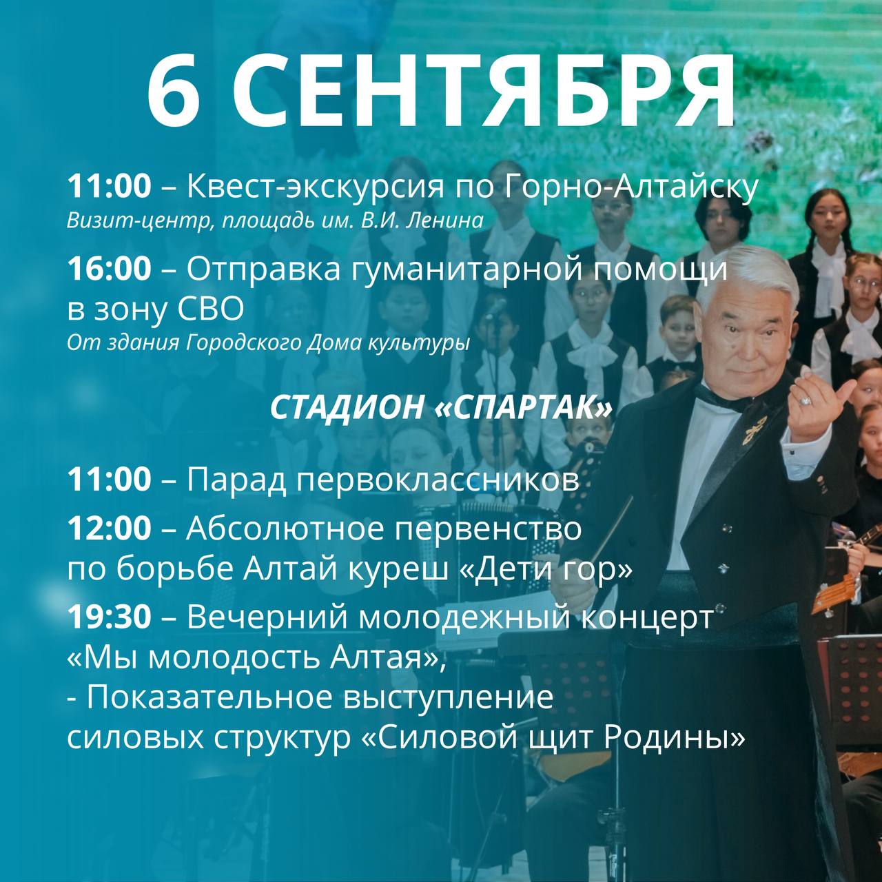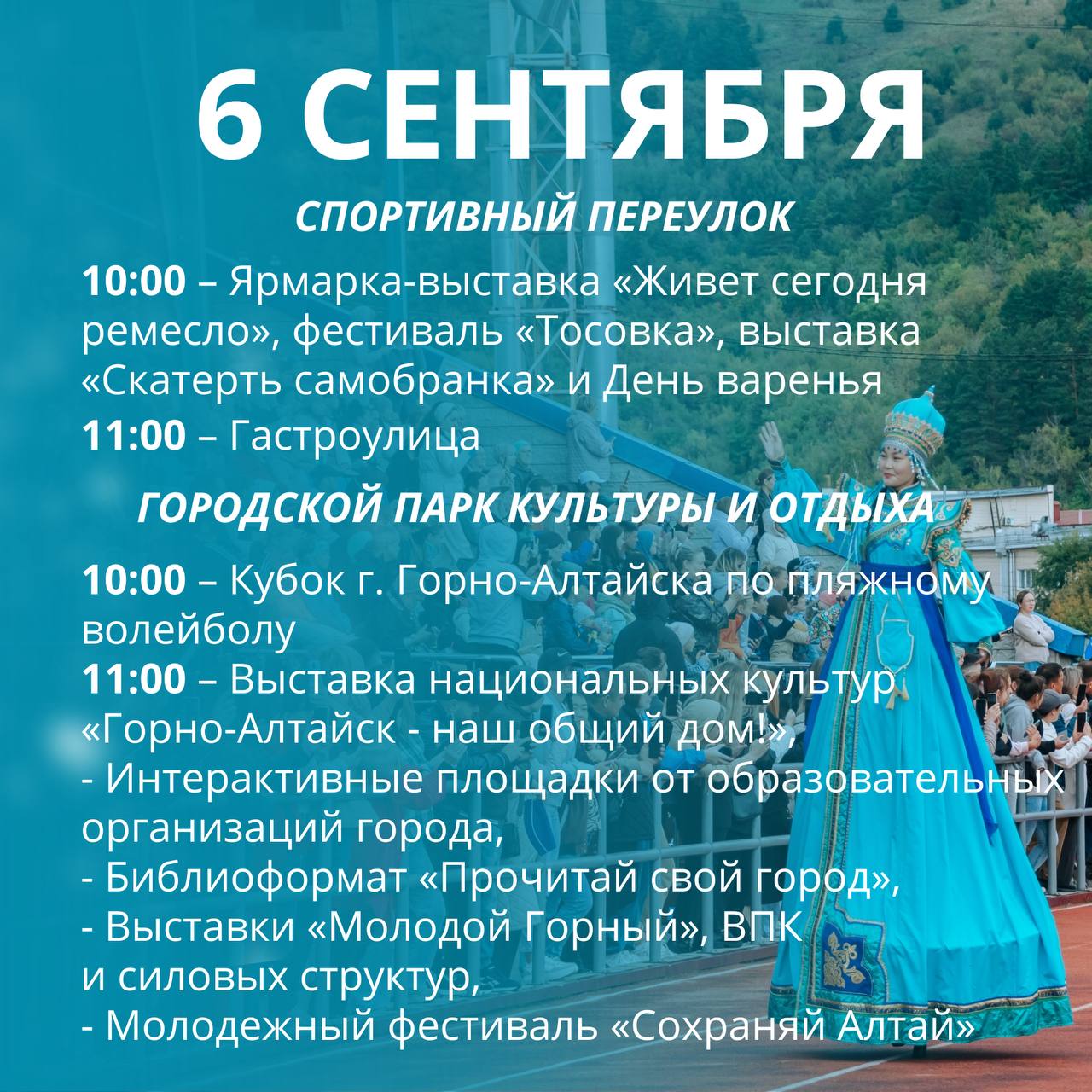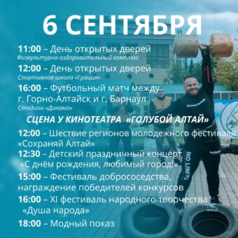 6 сентября все основные события пройдут в районе Городского парка культуры и отдыха (кинотеатр «Голубой Алтай»), в переулке Спортивном и на стадионе «Спартак». Это ярмарка-выставка «Живет сегодня ремесло», фестиваль «ТОСовка», День варенья (с 10:00), парад первоклассников, в котором примут участие около 1000 детей. Он начнется в 11:00 на стадионе «Спартак».