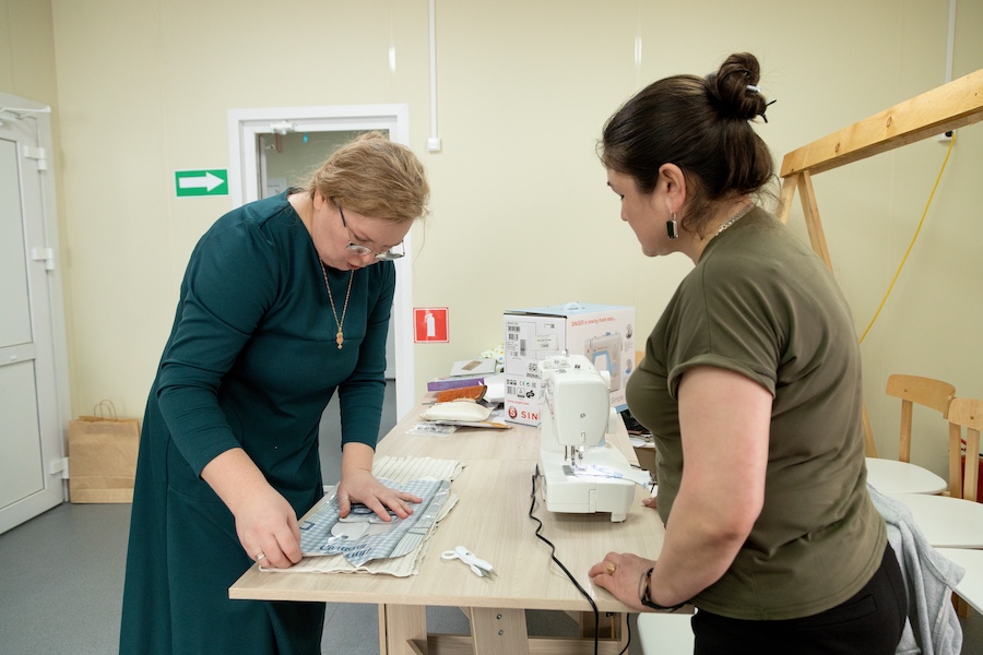 Курорт Сбера передал активистам две новые швейные машинки, а также организовал обучающий мастер-класс. Занятие провела Елена Пакшина — основательница волонтерской группы «Шьем и вяжем для наших. Республика Алтай», обладательница нагрудного знака «Доброволец России».