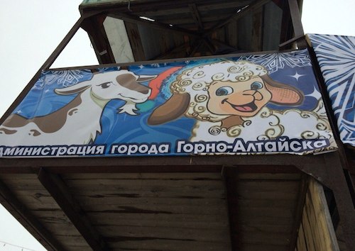 Вот такая фотография облетела сегодня горно-алтайские группы в социальных сетях. Администрация города, затратившая на подготовку новогодних городков около 2 млн рублей, оставила свою подпись под одним из баннеров на главной площади республиканской столицы.
