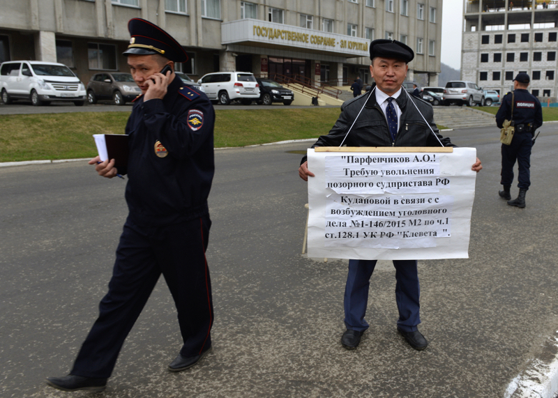 Сегодня, 22 апреля, в Горно-Алтайске у здания Госсобрания Республики Алтай перед началом сессии Эл Курултая прошли три одиночных пикета. Двое пикетирующих требовали справедливого разбирательства по делу о мошенничестве на заводе ЖБИ, один – увольнения бывшей супруги с должности судебного пристава.