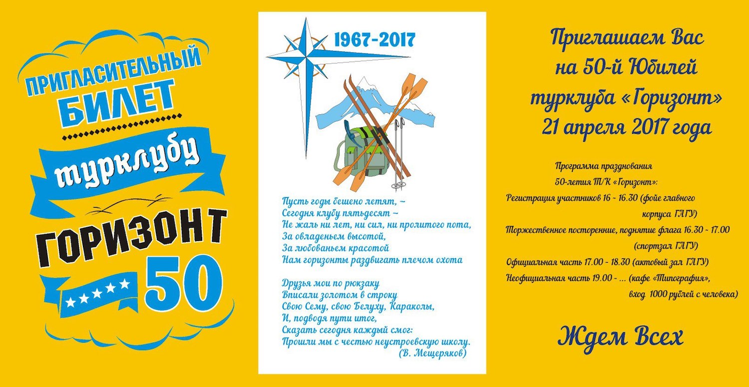 Дорогие друзья-туристы! Приглашаем вас на 50-й юбилей турклуба «Горизонт», на торжественную часть и дружеские посиделки. Ждем всех!