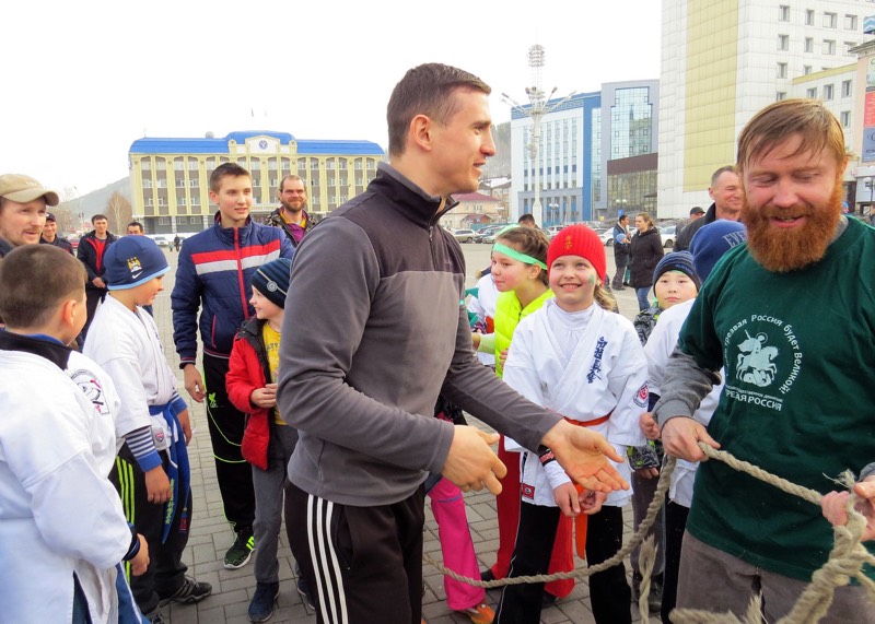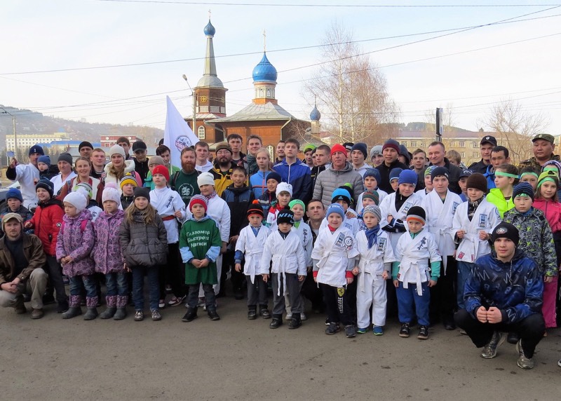 Пробежка началась в шесть часов вечера от городского ДК после короткой разминки. Колонна участников насчитывала несколько десятков человек, в основном, спортсменов-рукопашников из клубов боевых и спортивных единоборств «Император», «Торнадо», «Барс» и «Олимп», а также юных бойцов из Городского клуба кёкусинкай-карате и Клуба боевых единоборств с. Майма.