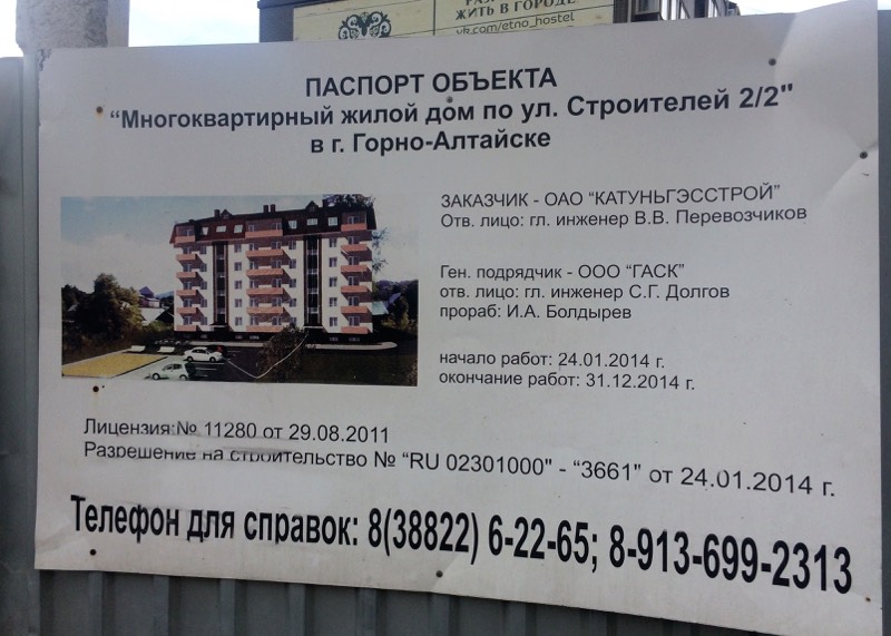 В Горно-Алтайске разыгрывается очередная история с недобросовестным застройщиком и обманутыми дольщиками. Речь идет о застройщике ОАО «Катуньгэсстрой» (ОГРН 1020400664129, ИНН 0408002981), директор Русин Алексей Сергеевич. Застройщик не исполнил своих обязательств перед участниками долевого строительства по строительству и передаче жилого помещения, расположенного по адресу г. Горно-Алтайск, ул. Строителей, 2/2 в оговоренный в договорах срок. Изначально срок был до 30 сентября 2015 года. В дальнейшем сроки неоднократно переносились, строительство велось нерегулярно и окончательно остановилось летом 2016 года.