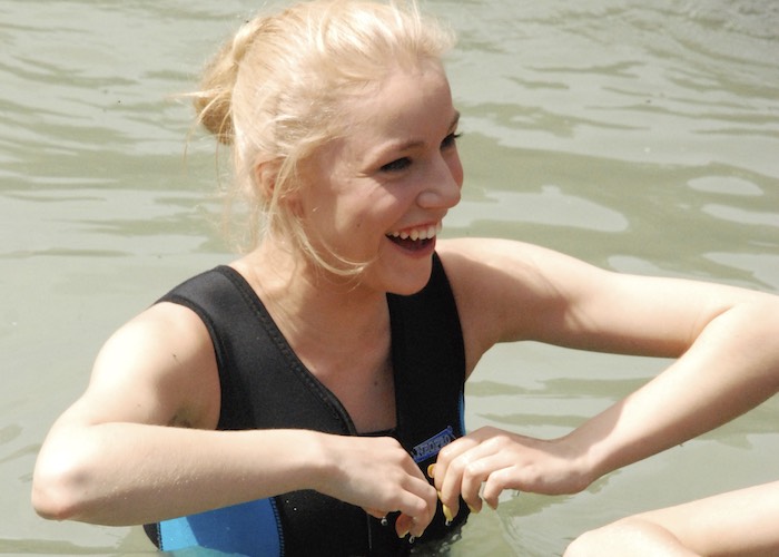 «То руки отбивала, то ноги – да так, что ходить не могла. Один раз чуть не утонули, когда нас понесло в лодке по реке, а на нас никаких средств защиты. По сценарию мы убегали так, как есть. И вот мы в этой лодке, на нас ничего нет, нас несет на пороги, лодка при этом протекает… Я человек очень мнительный, так что подумала, что это конец», – вспоминает она.