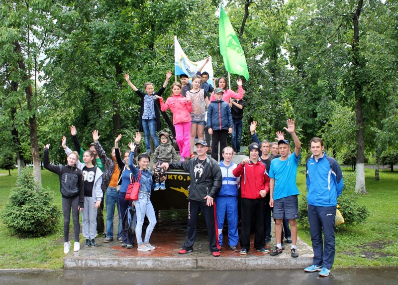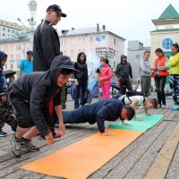 В 14 часов участники пробежки вышли на городскую площадь, поднялись на помост центральной сцены и развернули плакат с надписью «1000 отжиманий за Россию».
