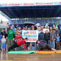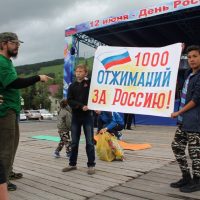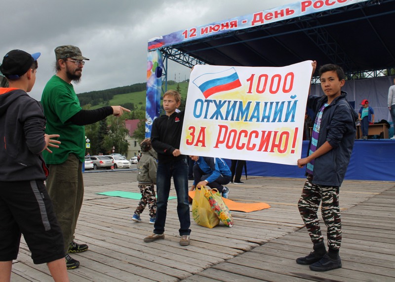 Несмотря на дождь, в акции «Отожмись за Россию» приняли участие около тридцати человек. Редко кому удалось отжаться меньше двадцати раз, в основном – раз тридцать-сорок. Один юноша отжался семьдесят пять раз. Двадцать раз отжался за Россию уважаемый в нашей Республике человек, заслуженный артист России Николай Амырчинович Кара-Майманов. Все результаты фиксировались на бумаге. Тысячу отжиманий участники акции совершили минут за пятнадцать, а затем сделали общее фото.