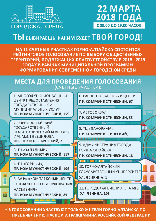 Сегодня, 22 марта, в Горно-Алтайске проходит голосование по выбору проектов благоустройства общественных территорий. С 9:00 работают 11 счетных участков, на которых жители Горно-Алтайска, предъявив паспорт с городской пропиской, могут отметить в списке понравившийся им проект. Всего в голосовании участвуют девять проектов, проголосовать можно за пять из них. Голосование продлится до 19:00 часов.