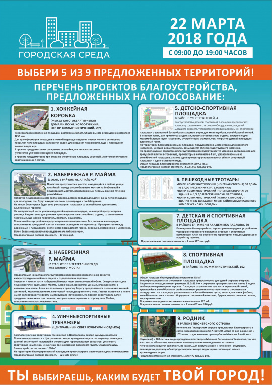 Всего на выбор горожан представлено девять проектов. С их подробным описанием можно ознакомиться по этой ссылке.