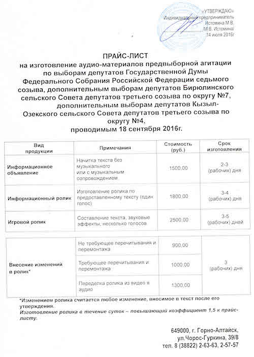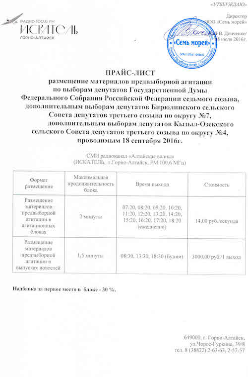 Расценки на размещение предвыборных агитационных материалов политических партий, их региональных отделений, кандидатов на выборах депутатов Государственной Думы Федерального Собрания Российской Федерации седьмого созыва в...