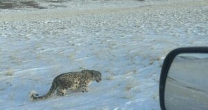 Уникальное фото: у дороги в урочище Уландрык встретили снежного барса